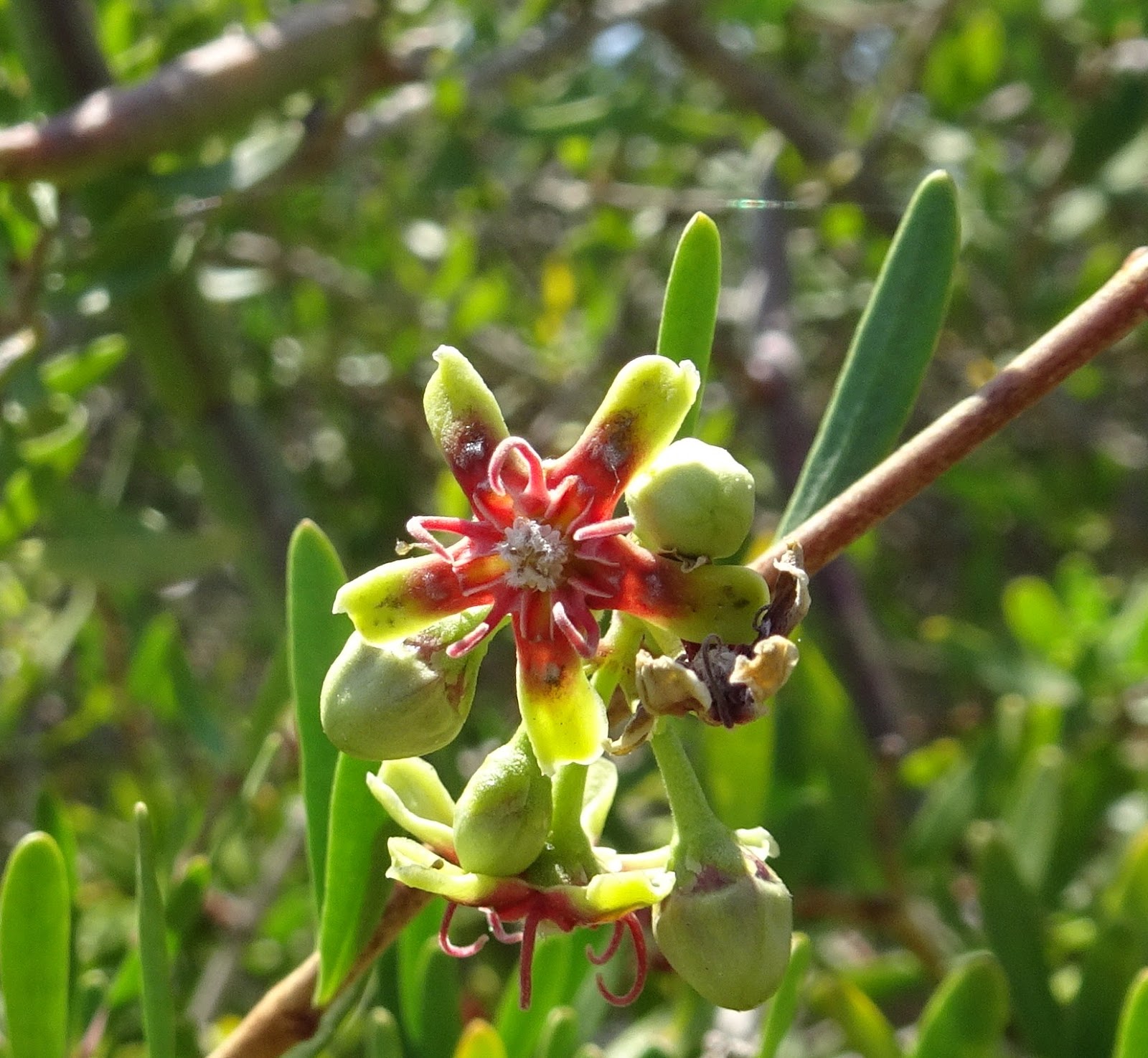 -Flores solitarias o en pequeños grupos, al final de las ramillas, de simetría pentámera, con forma de estrella, morado-parduscas, en ocasiones de extremo verdoso, lateralmente apiculadas y de cinco lóbulos internos a modo de apéndices curvados, que convergen hacia el disco central blanquecino amarillento, donde se concentran los órganos sexuales. Florece todo el año exceptuando el verano.